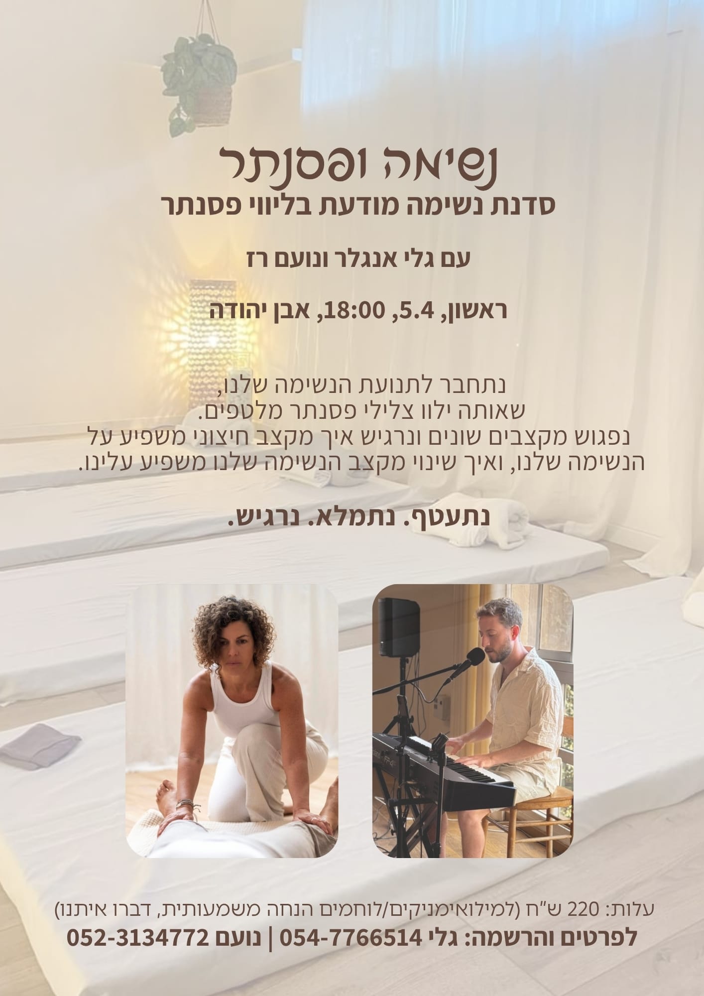 נתחבר לתנועת הנשימה שלנו, שאותה ילוו צלילי פסנתר מלטפים. נפגוש מקצבים שונים ונרגיש איך מקצב חיצוני משפיע על הנשימה שלנו, ואיך שינוי מקצב הנשימה שלנו משפיע עלינו.